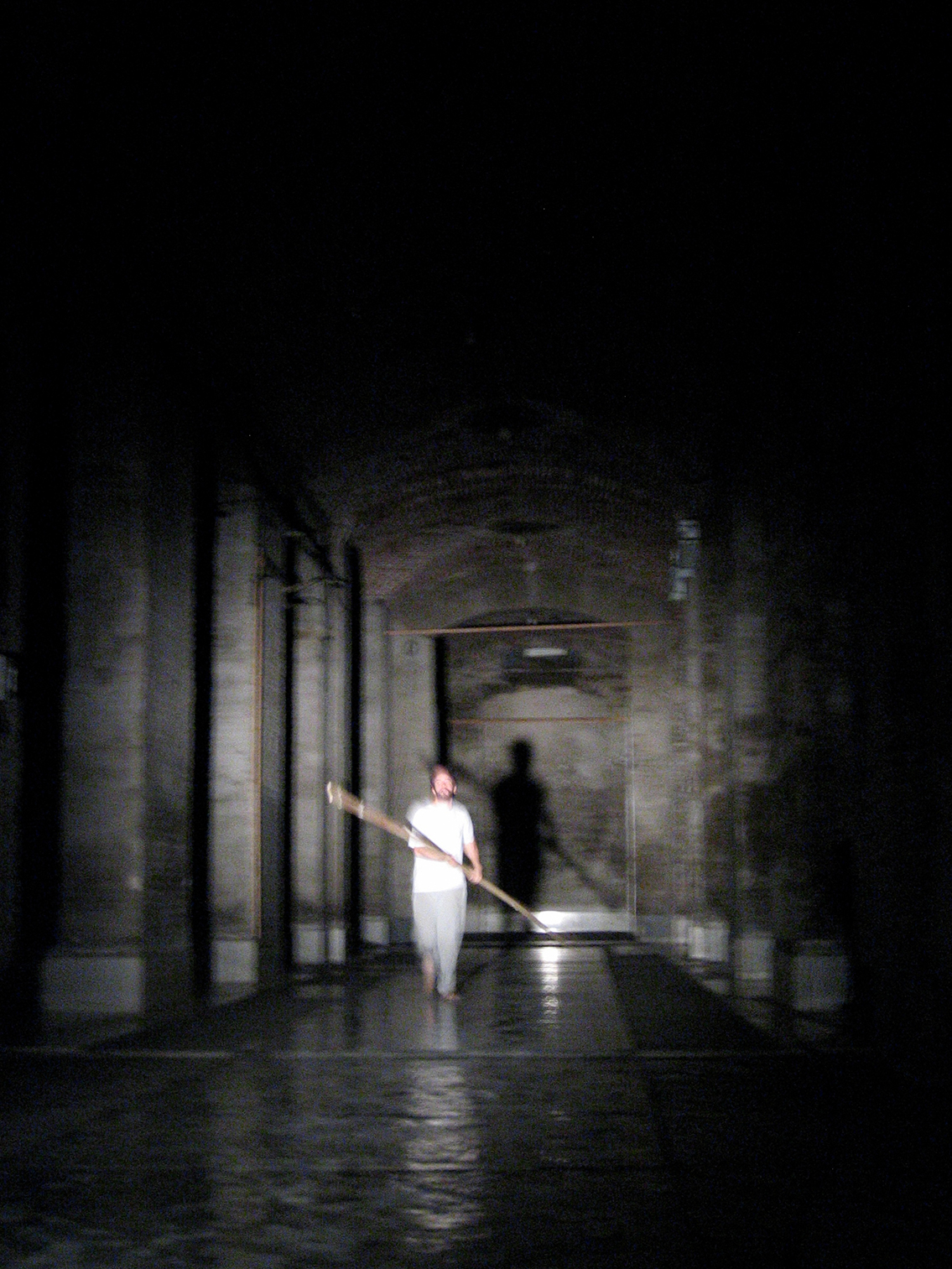 A 34-metre-long hall as a starting point. The audience looks at the scene from one end. The scene and its depth are structured just like in represented space in painting where perspective is the axis and the law.