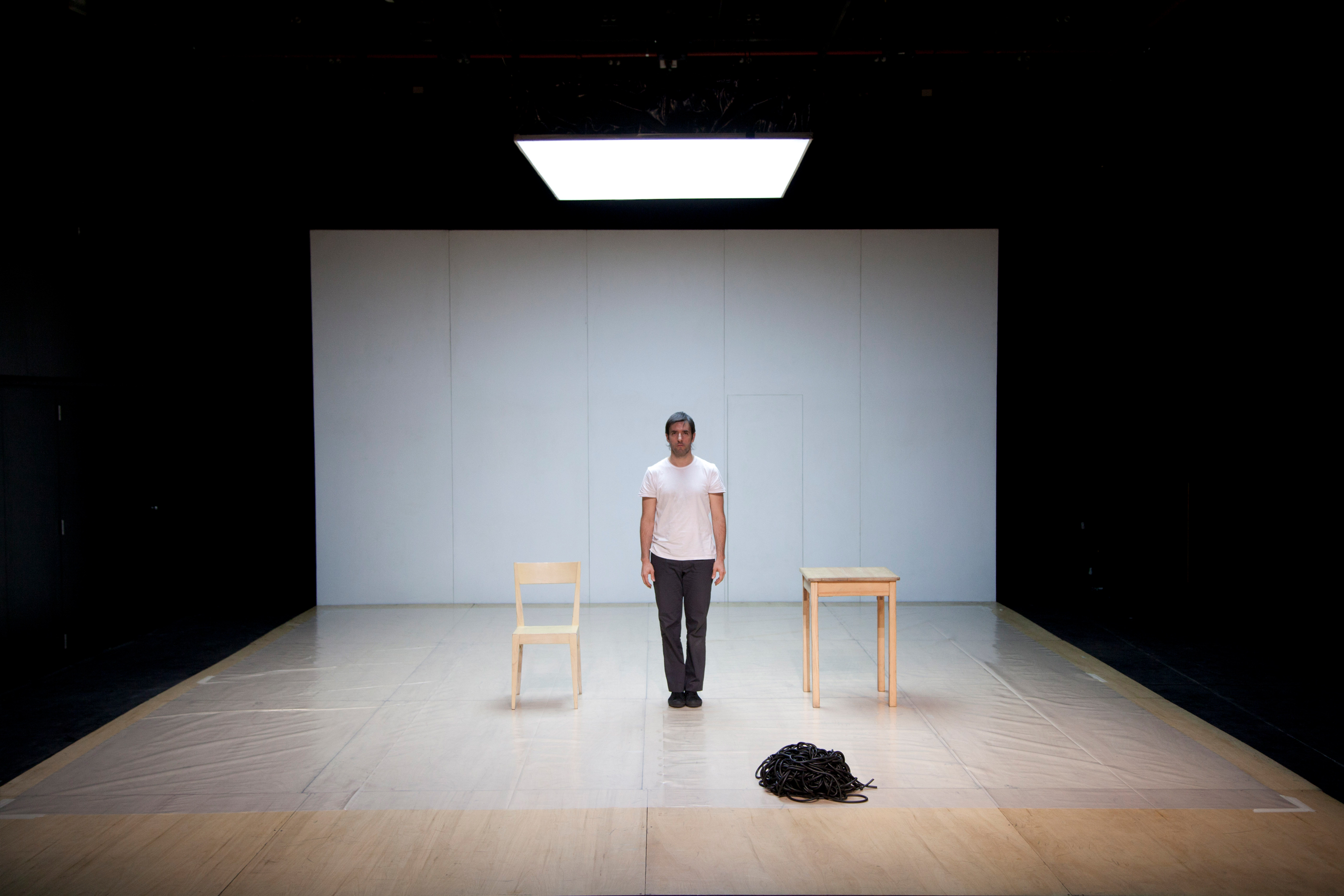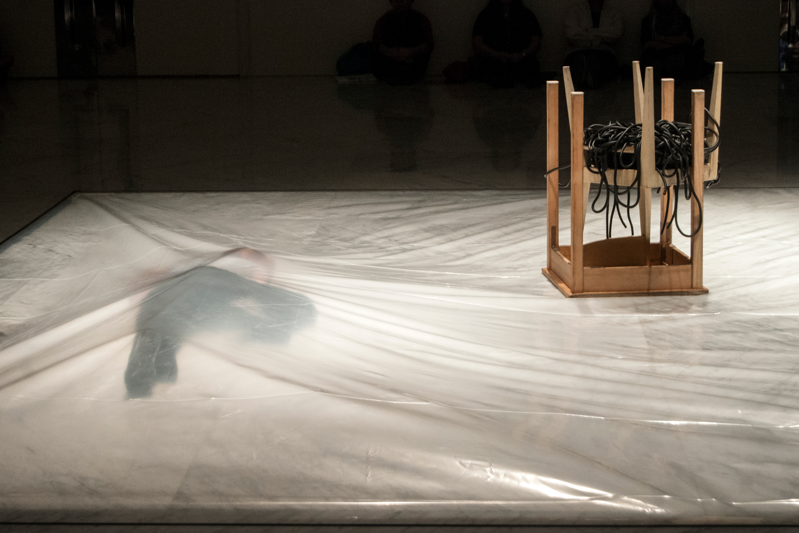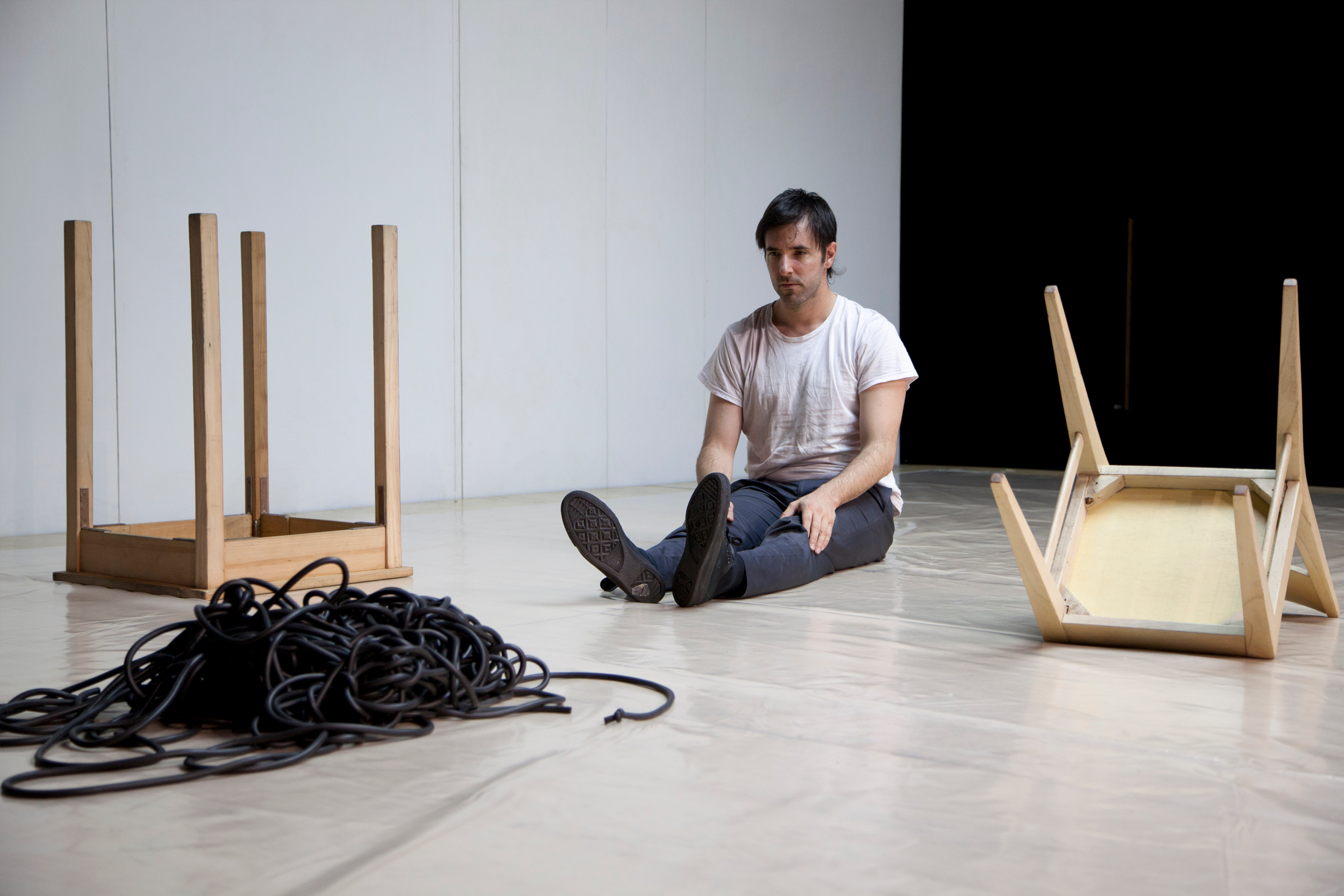 These relations force a new logic: the objects’ logic. A table, a chair, a wire and some plastic will also leave their condition behind in order to near the movement of the man/woman to finally access a new understanding sharing space and movement without any hierarchies. They all become one single object.