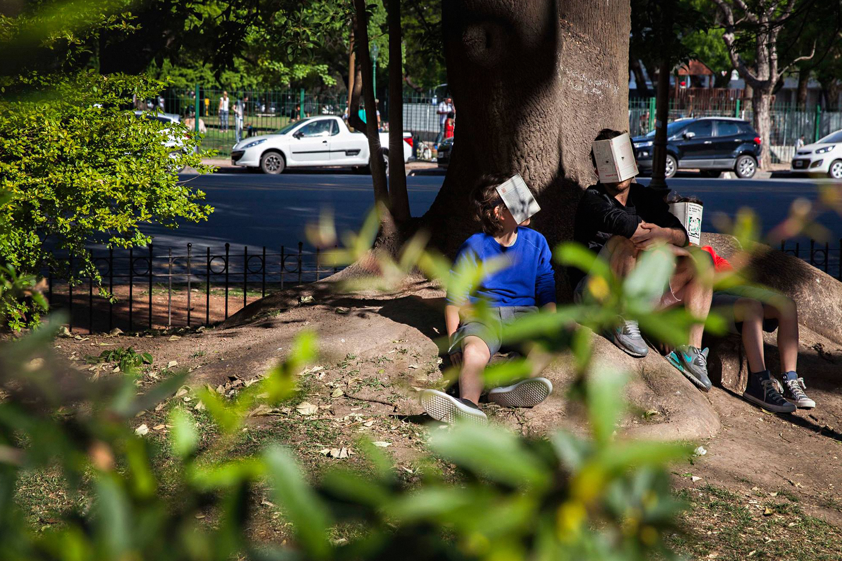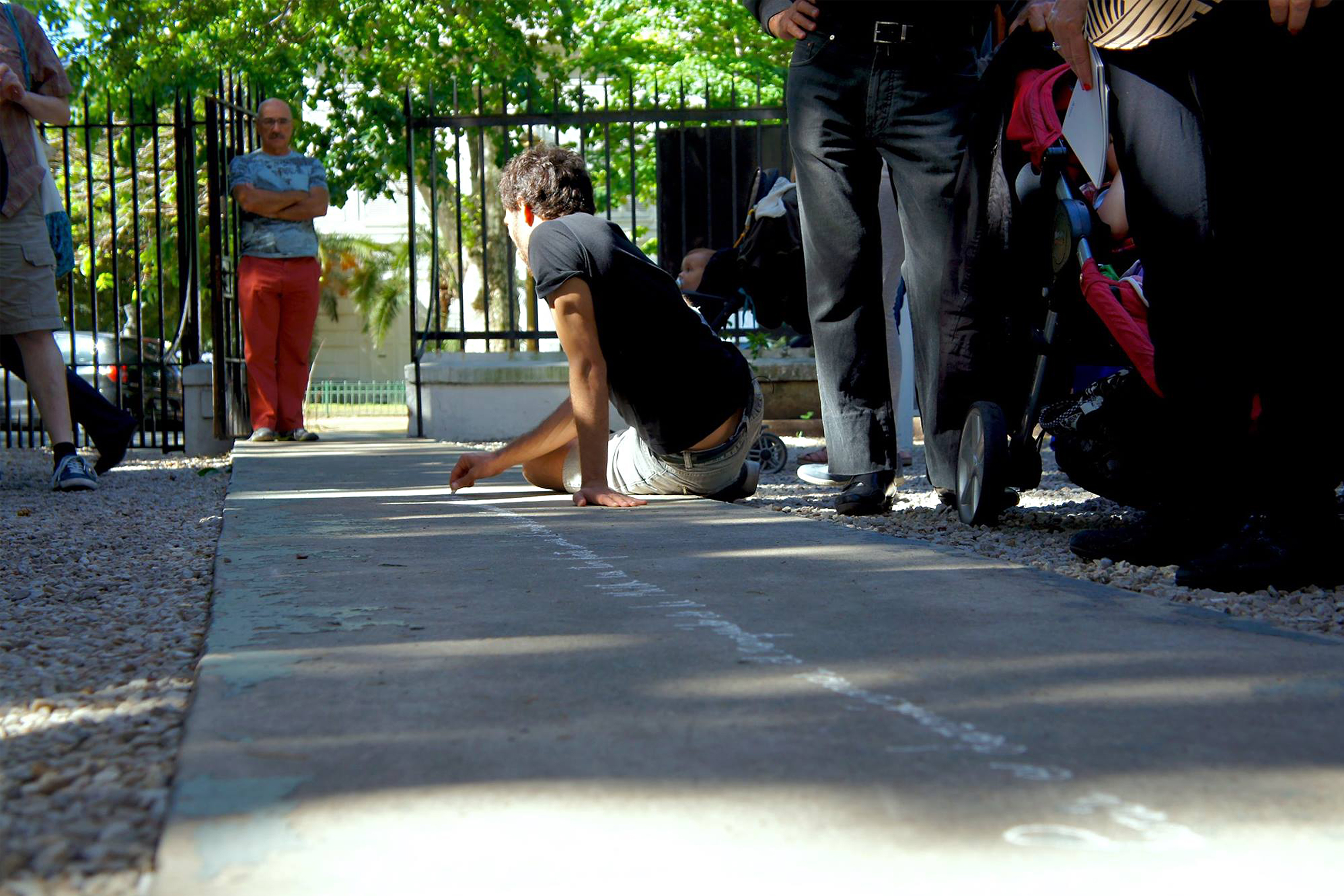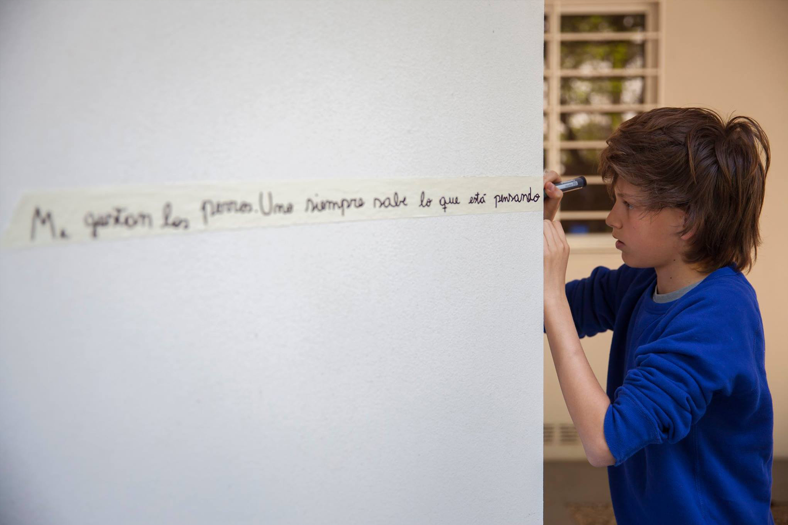 Dos niños y un muchacho guían al público por las instalaciones creando una suerte de imágenes que evocaran el acto de leer y de escribir, creando un clima de intimidad, y silencio.