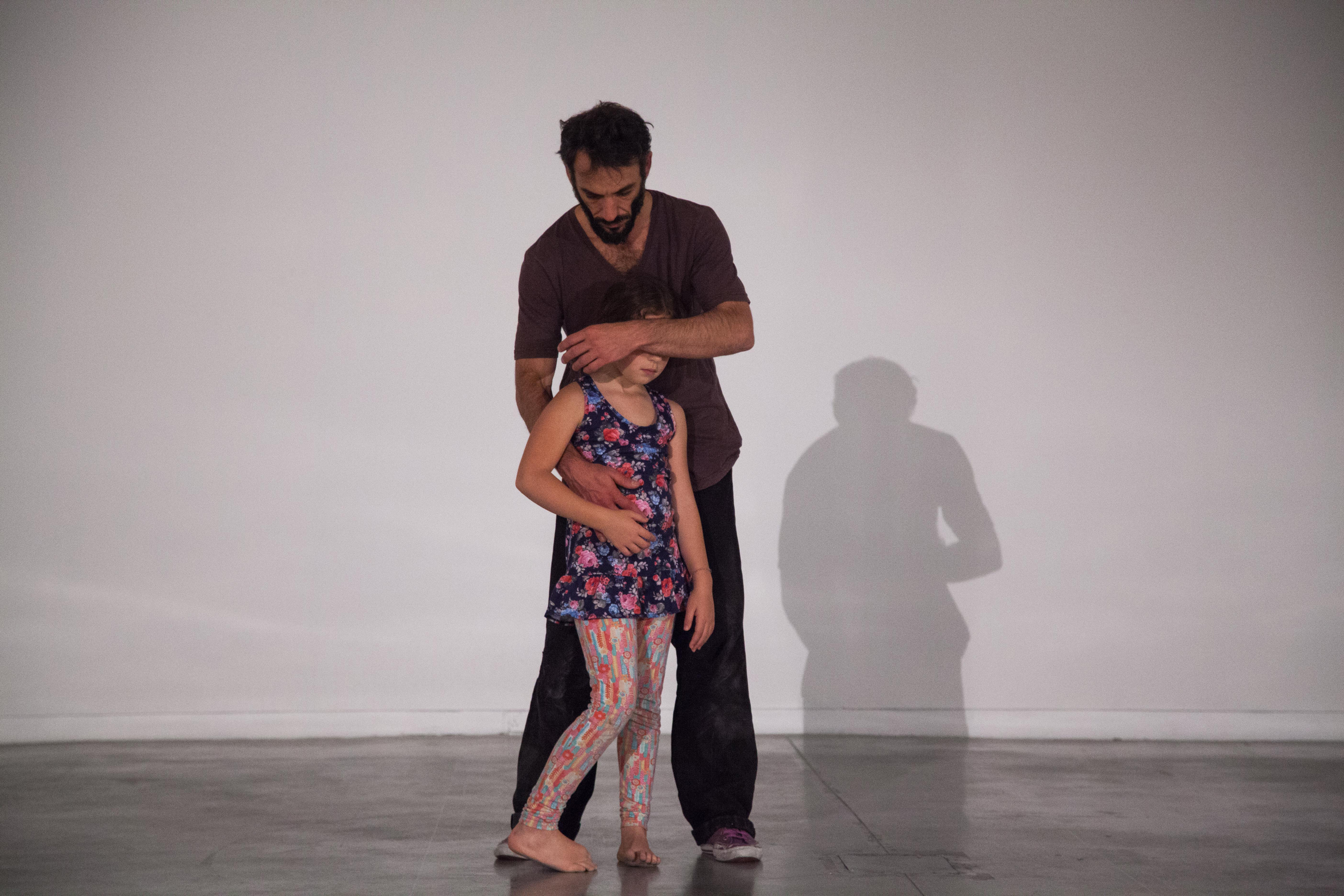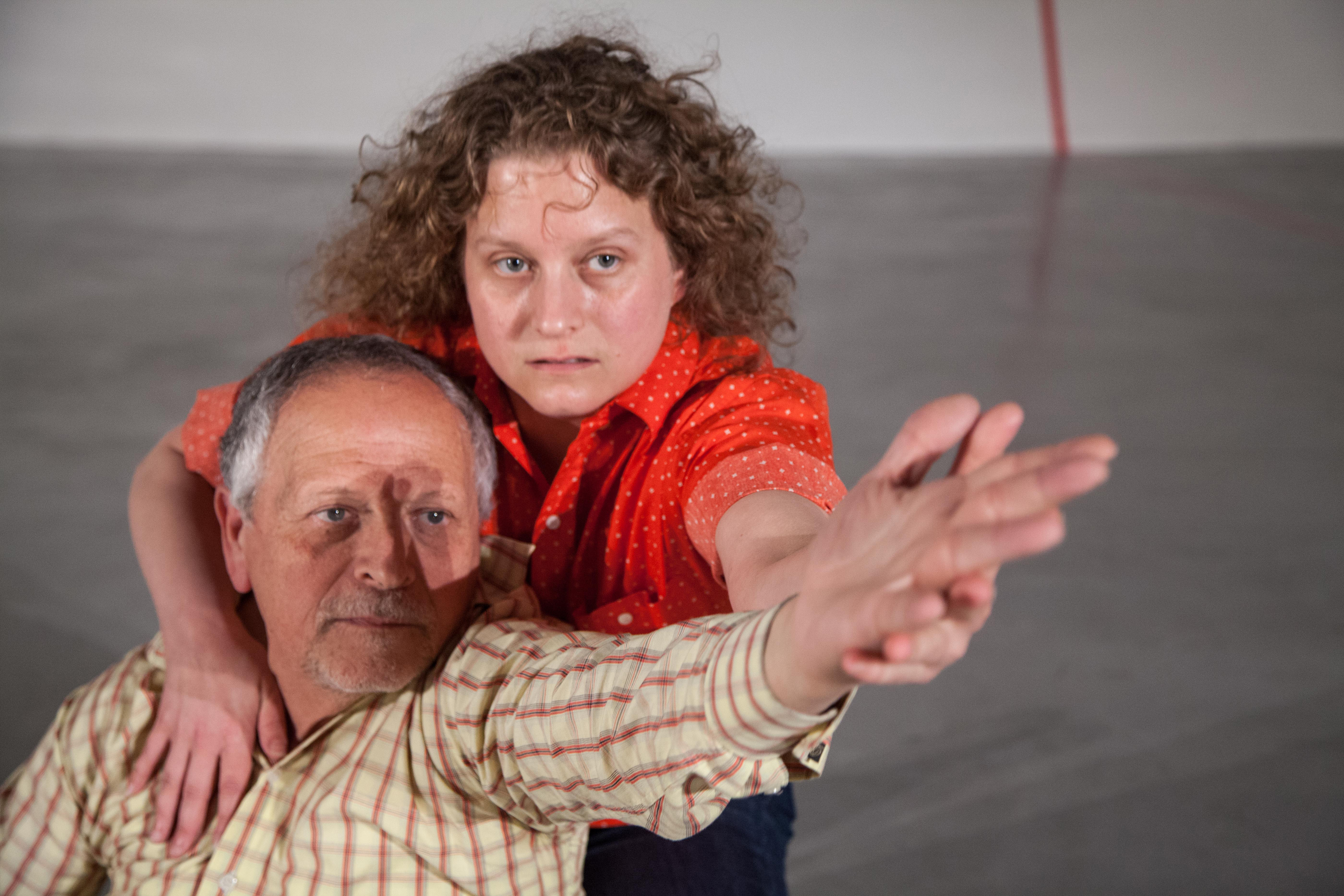 A dancer dances with her father. A dancer dances with his mother. A dancer dances with his son. A dancer dances with her sister. Then the dancers improvise following that physical impression - the remaining contact - while their relatives look after them